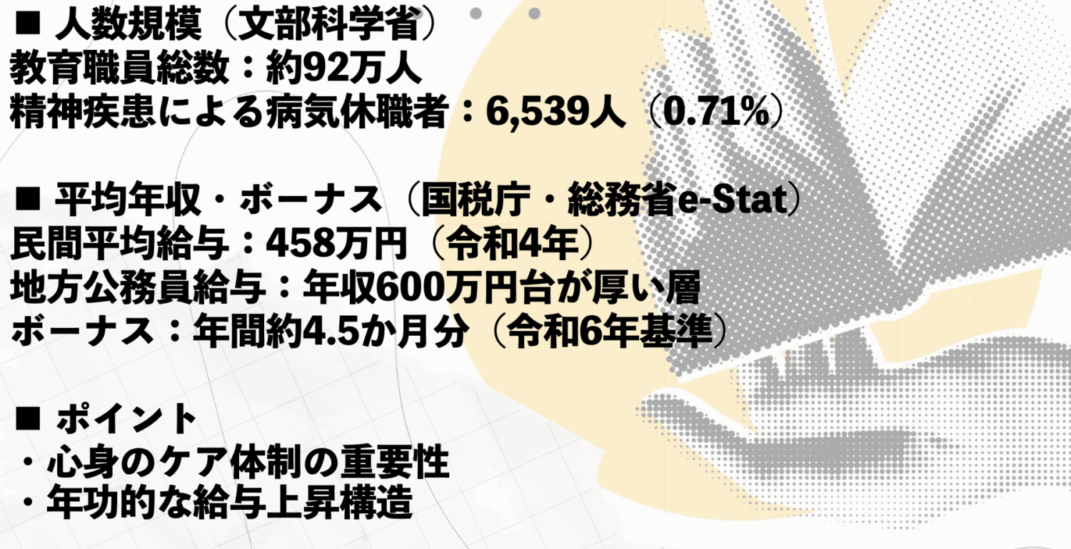 日本の公立学校の教育職員(校長・教頭・教諭等、幼稚園を一部含む)の総数は約92万人(919,987人)。このうち、精神疾患による病気休職者は6,539人(0.71%)で、近年増加傾向が指摘されています。教育職の規模感と同時に、心身のケア体制の重要性もデータから読み取れます。